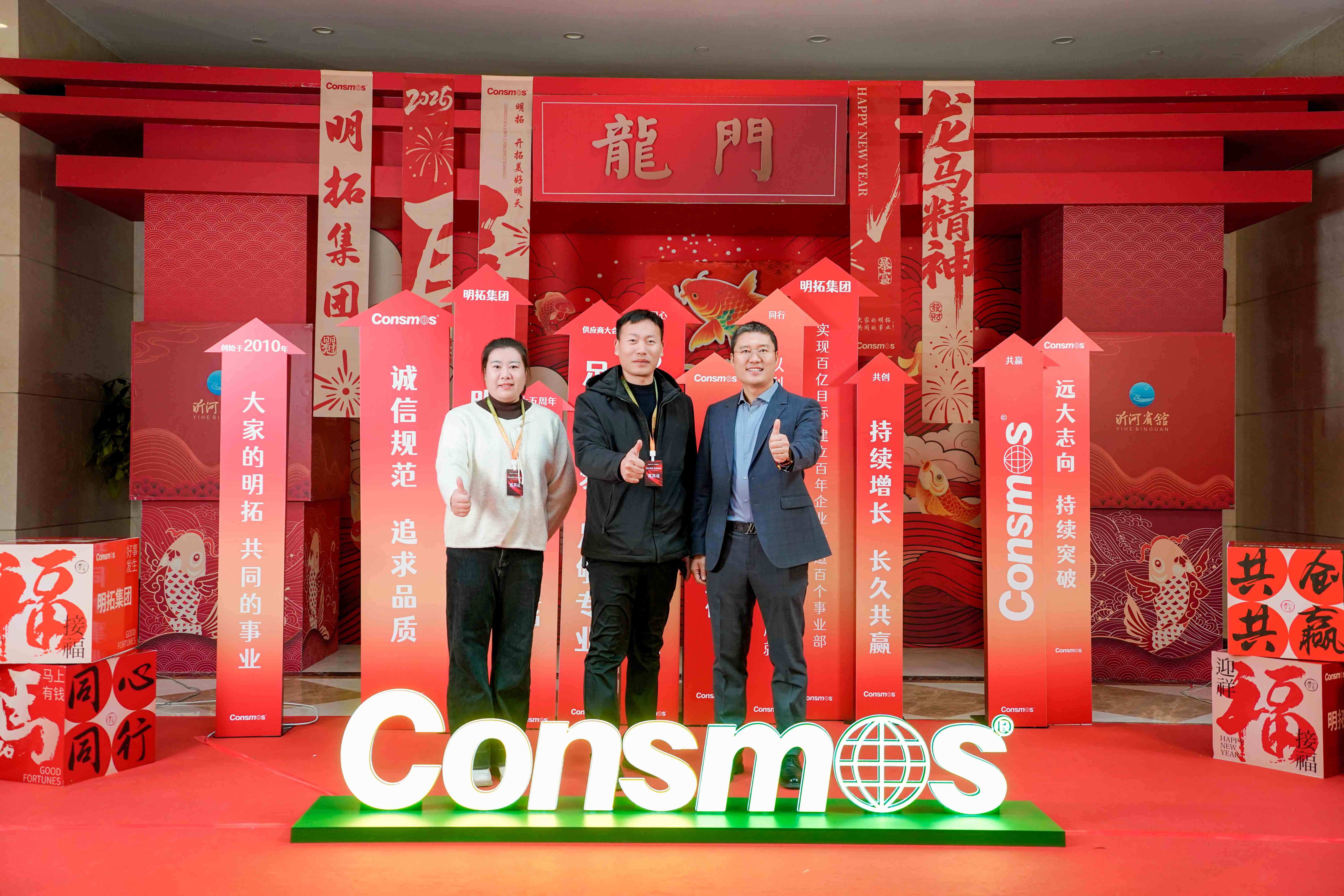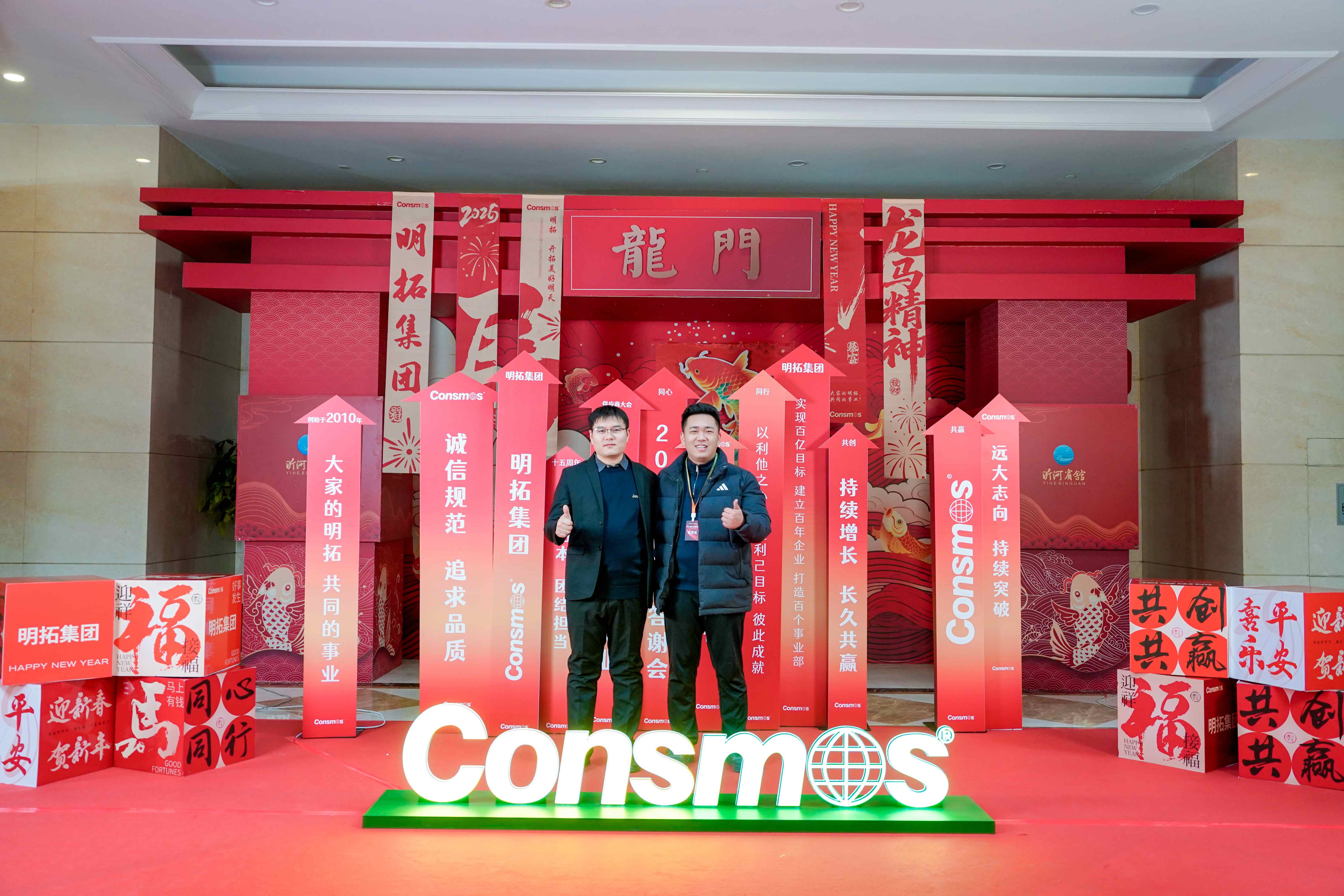 随后,供应商伙伴们移步沂河宾馆会场,纷纷在主题签到墙、打卡区前驻足签字、合影留念。工作人员为每位到场伙伴送上了精心准备的伴手礼 —— 寓意吉祥顺利的精美摆件与 CONSMOS 定制红酒,一份份心意满载着明拓对合作伙伴的感恩之情,温馨的布置与贴心的服务,让整场活动从一开始就充满了团圆与信赖的氛围。
