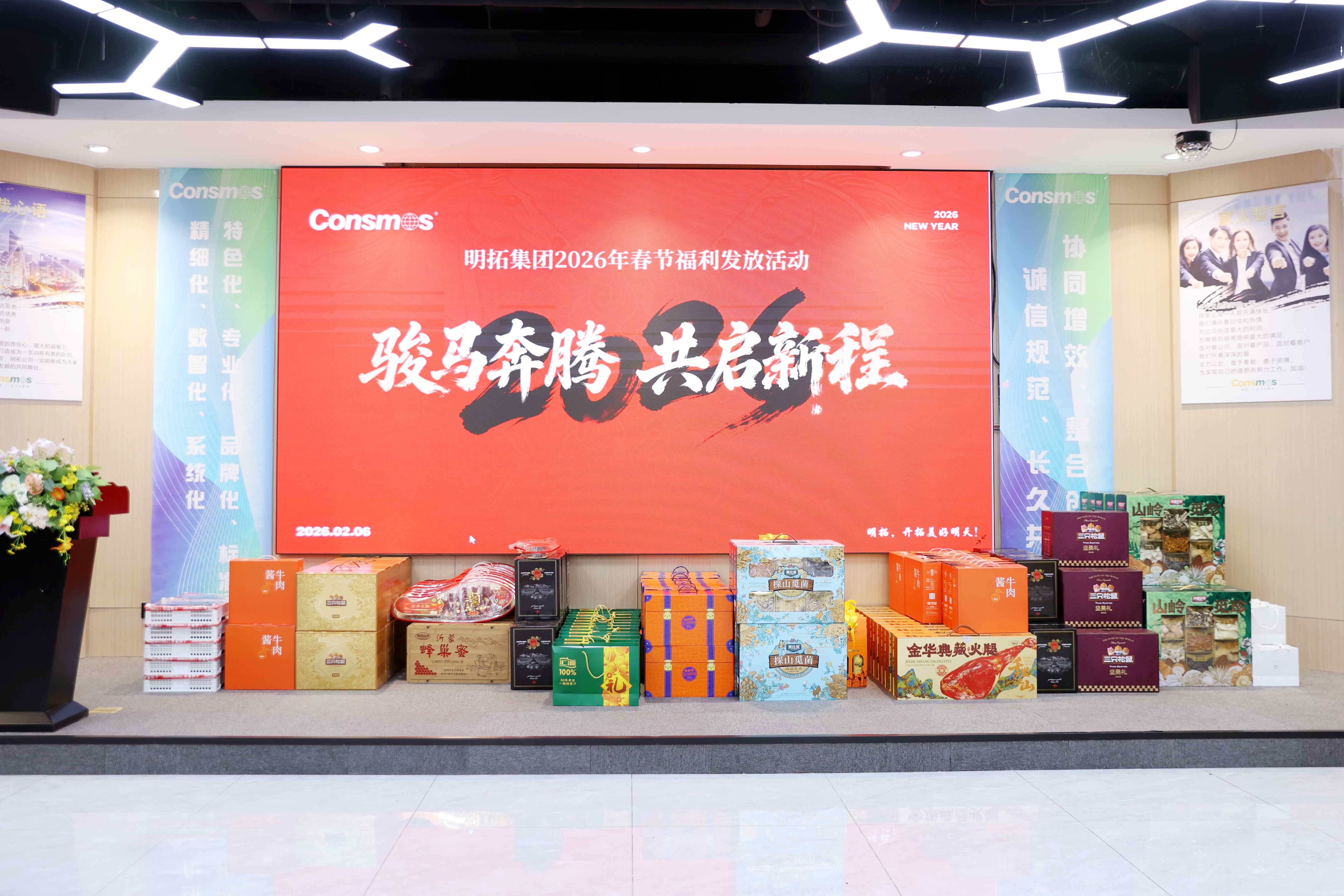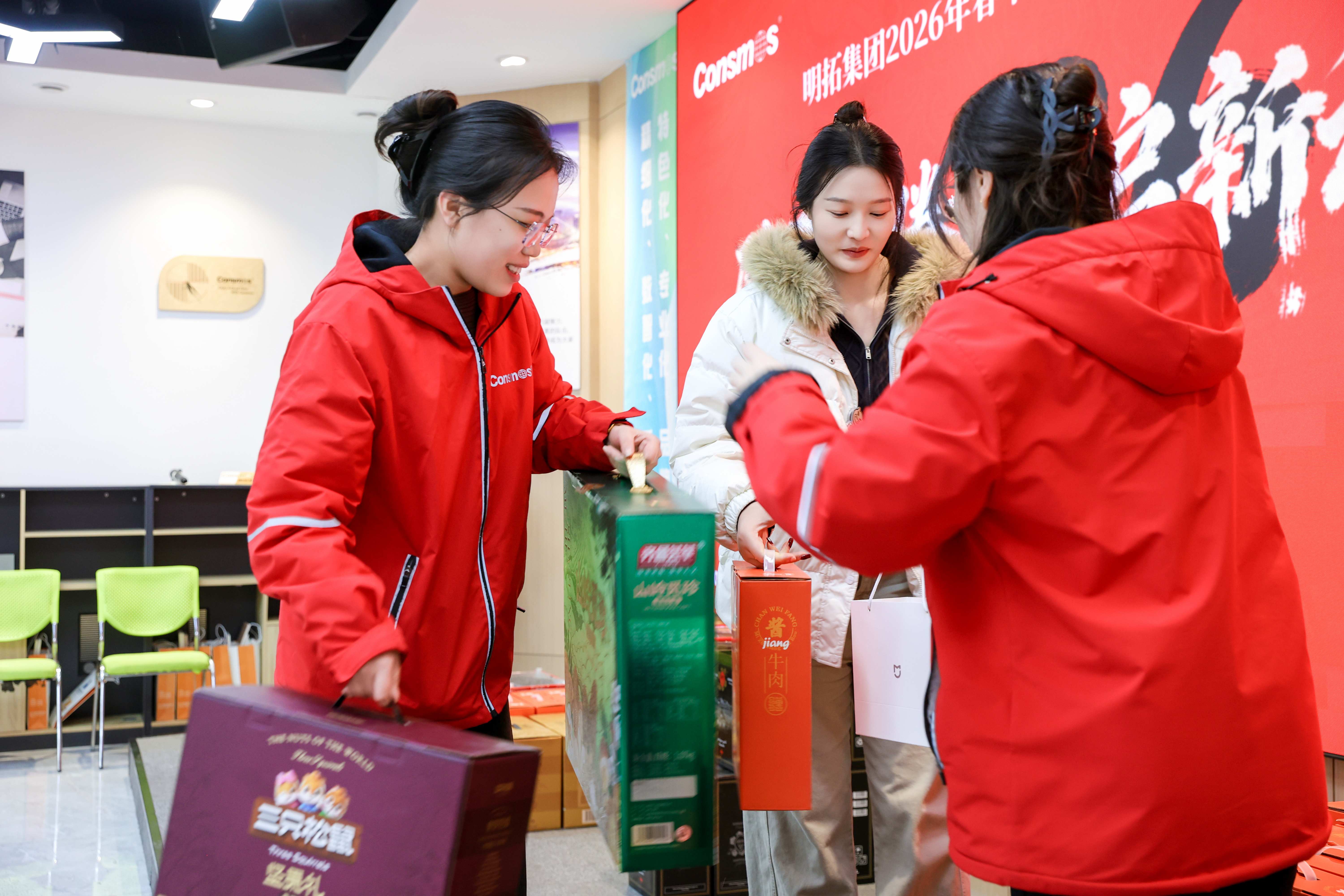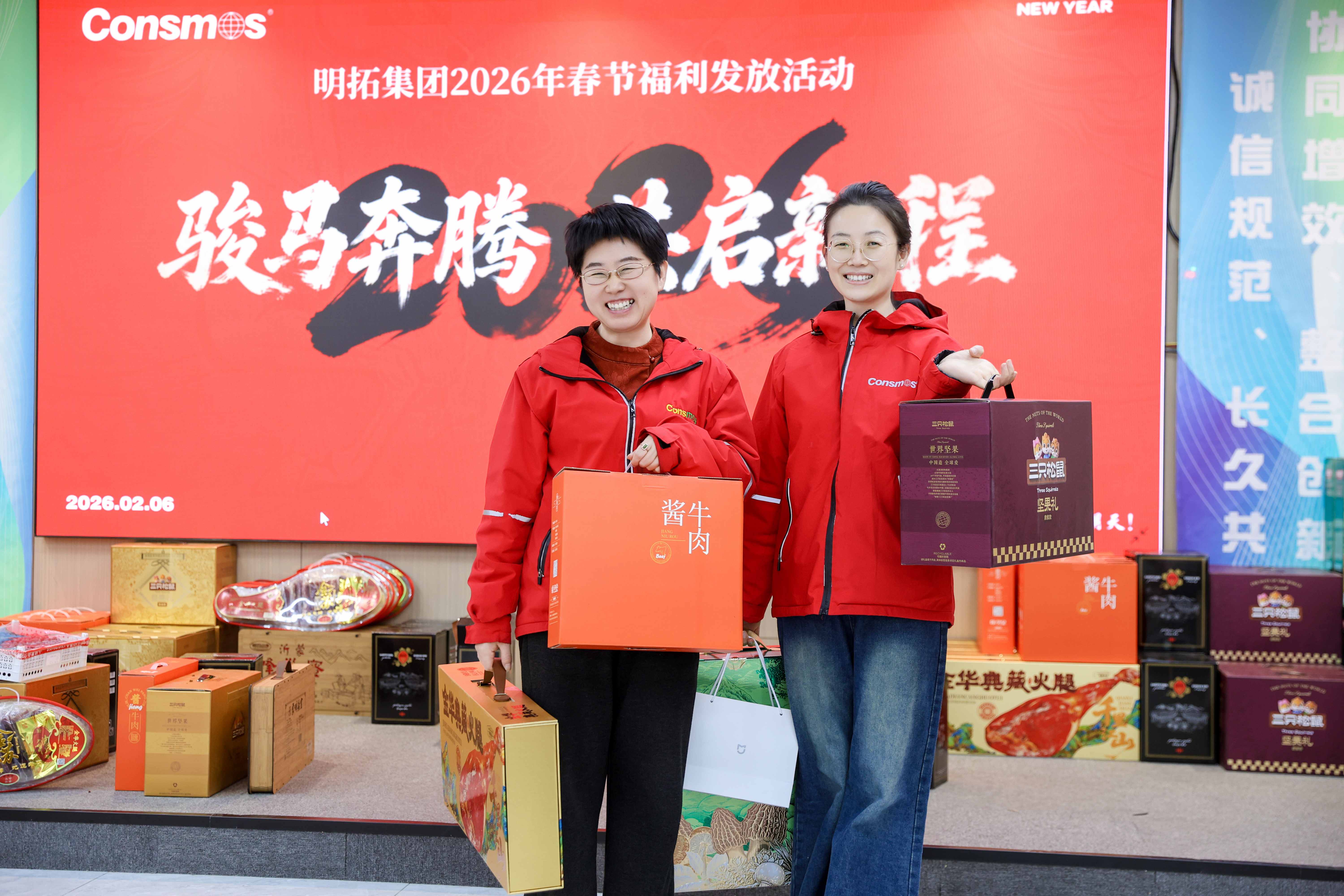 与此同时,2026马年春节福利同步暖心发放。集团延续用心细致的风格,结合节日氛围与家庭需求,定制了兼具实用性与仪式感的福利方案:醇香CONSMOS定制红酒、风味熟食、营养菌菇、坚果零食、新鲜果礼、健康饮品等品类丰富,覆盖团圆餐桌与日常闲暇。每一份福利都经过反复斟酌,既贴合个人口味,又兼顾家庭场景,让这份岁末福利不仅是物质的补给,更成为连接集团与员工的情感纽带,彰显“大家的明拓,共同的事业”的核心理念。