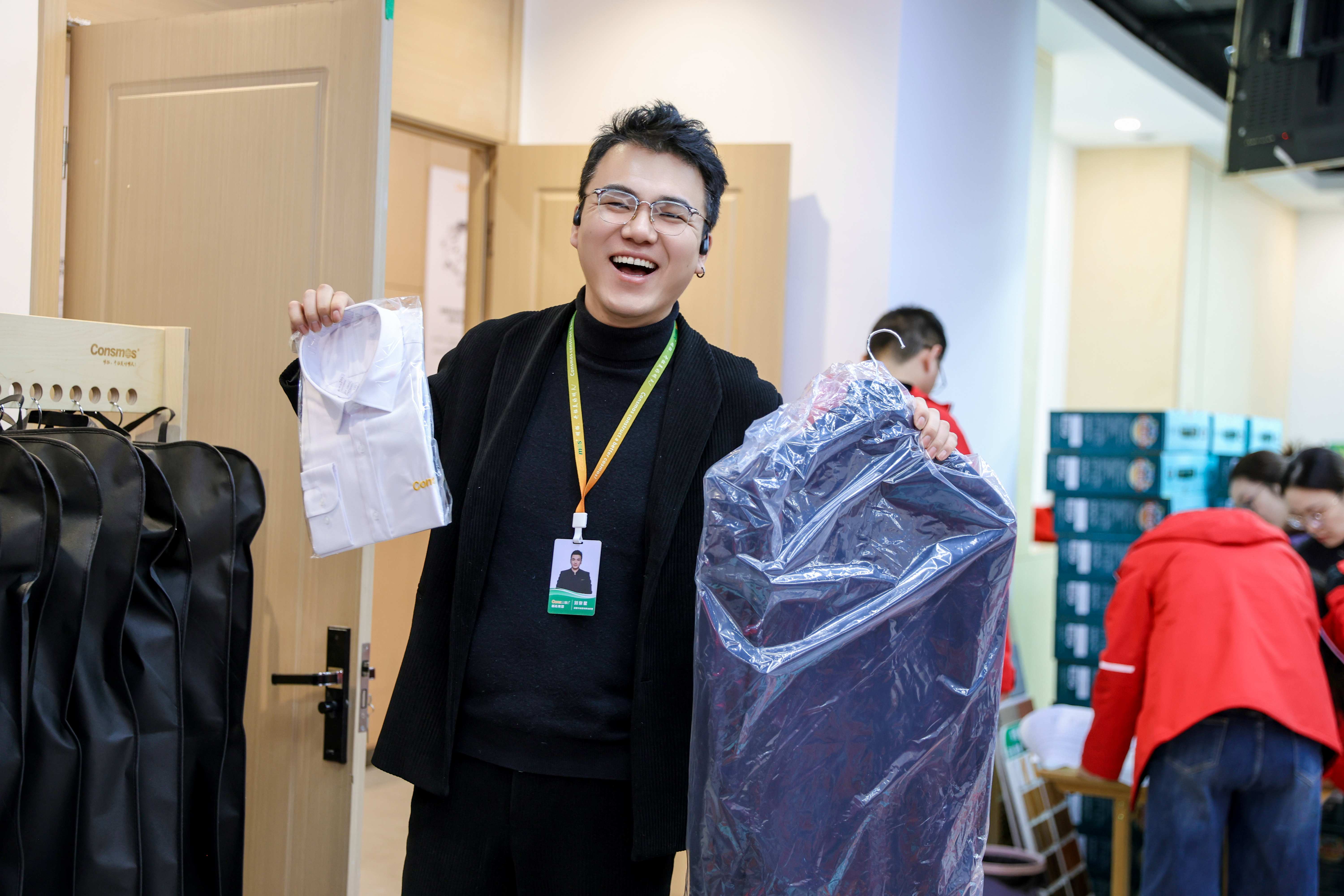 发放现场秩序井然、暖意融融。集团大会议室内,定制西装与春节福利礼盒整齐排列,精致的包装衬着新春喜气格外亮眼。各部门员工有序列队领取,不少人领到西装后当场试穿,互相欣赏夸赞,接过礼品的瞬间,脸上洋溢着真切的喜悦与自豪。